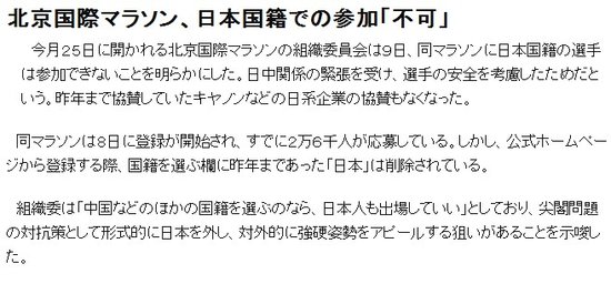 北京国际马拉松赛将于11月25日在北京举行,各国选手的报名从8日开始。但是,在报名的网站上,国籍选择一栏中,“日本已被删除”。同时,全日空等日企的赞助资格也被取消。