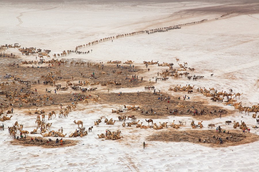 埃塞俄比亚,阿沙尔湖,运输盐的商队。乔治•斯坦梅茨摄于2011年。这些照片是斯坦梅茨乘着机动滑翔伞拍摄完成的