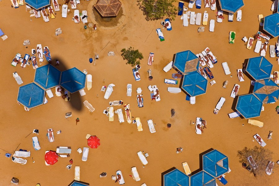 以色列,死海,晒日光浴的人。乔治•斯坦梅茨摄于2008年。他的滑翔机还很有可能会降落到居民的院子里,好心的主人也许会请他喝杯茶,有时还会在当地引发轰动。