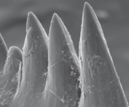 哪一种动物长有动物界最锋利的牙齿同时又没有颚部,答案是史前牙形虫。这种动物身长只有约5厘米,生活在2亿年前,用于撕碎食物的牙齿比人类头发还细。这幅照片是史前牙形虫的扫描电子扫描图像。由于尺寸太小,我们无法用肉眼看到牙形虫牙齿的真容。