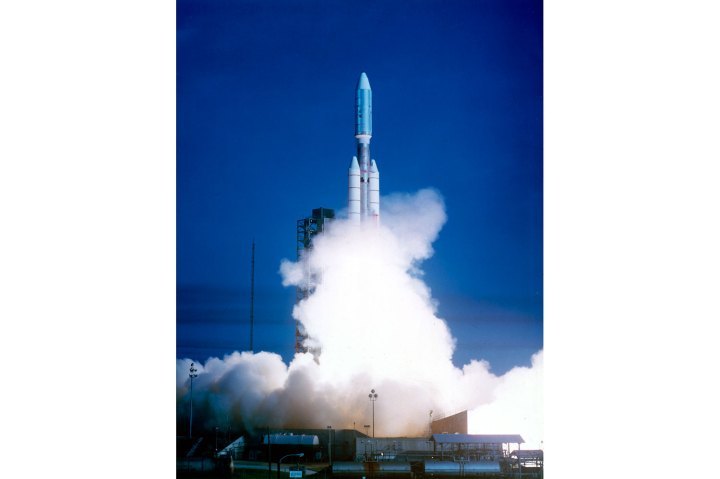 卡纳维拉尔角的肯尼迪航天中心,运载着旅行者1号的大力神运载火箭正发射升空。旅行者1号是1977年第二艘发射升空的飞船,它在去往木星的旅途中赶上了旅行者2号。1979年3月,在旅行者1号飞往土星之前,它与木星的距离曾达到最近的27.8万公里。