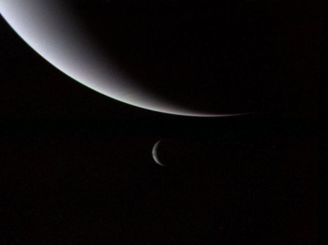 飞越海王星及其卫星海卫1三天之后的情景。图片下方呈新月形的是海卫1。