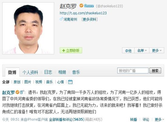 河南反对平坟政协常委写遗书 称准备好杀身成仁