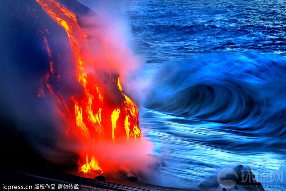 两名大胆的摄影师冒着生命危险,近距离拍摄燃烧的岩浆流入大海时的场景,十分震撼。拍摄时,水温高达110华氏,距离那些燃烧的岩浆只有咫尺的距离,但他们只在相机上进行了简单的防护,穿着简单的有用装备,随着海水沉浮,拍下这些让人无比震撼的场景。