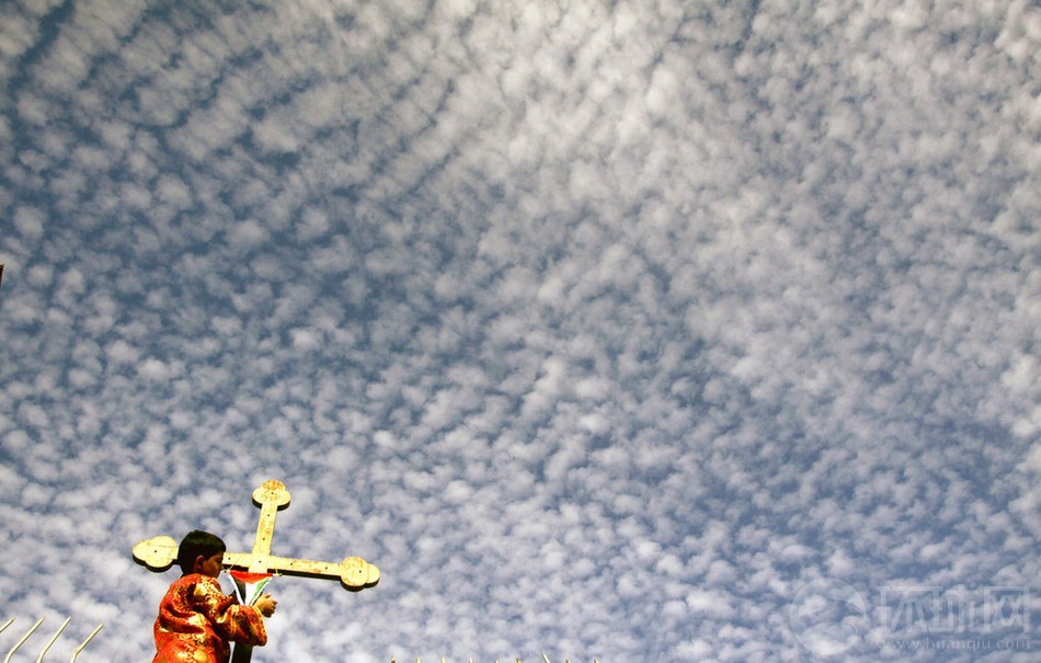 当地时间2012年11月30日,约旦河西岸Jenin,人们在圣乔治默基特希腊礼天主教祈祷,一名小男孩把巴勒斯坦国旗挂在巨大的十字架上。巴勒斯坦人庆祝“入联”成功