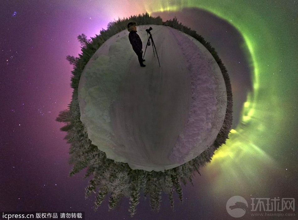 这看起来是十分奇特的景象,一个人站在自己的星球上欣赏极光。而这个人站立的地方相极了一个星球,实际上这是瑞典摄影师拍摄的在北极拍摄的图片