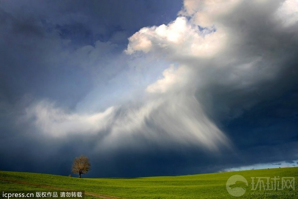 当地时间2012年4月10日,德国Bertoldshofen,绿色的田野上空形成奇特形状的云。