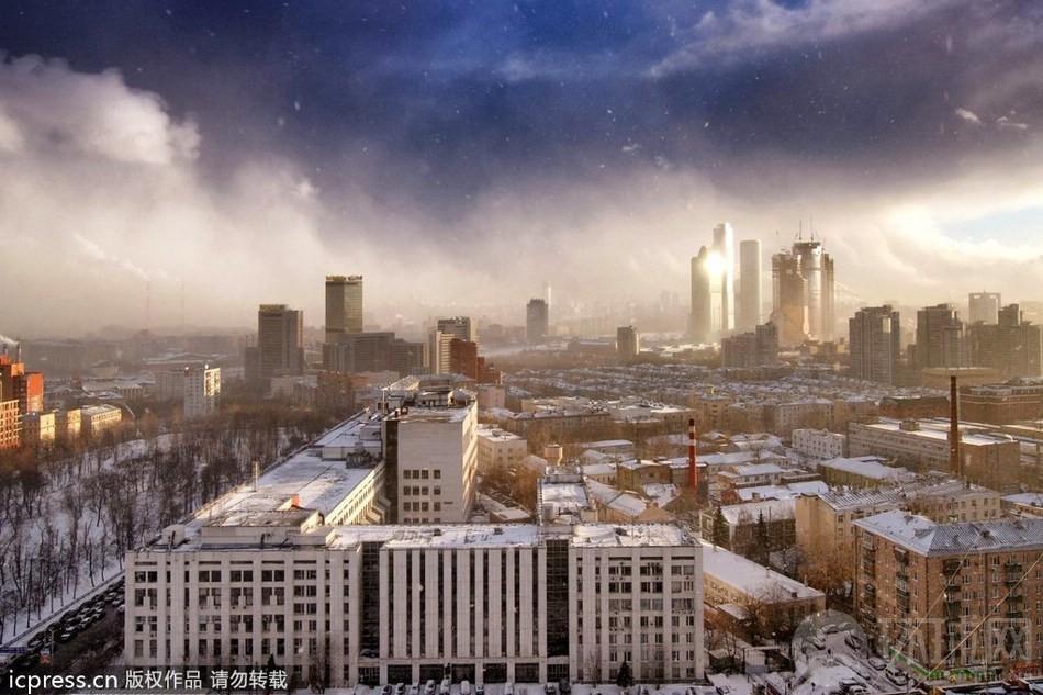 当地时间2012年4月25日,俄罗斯莫斯科,摄影师无意间抬头发现天空呈现出神奇的变化。天空好似被分为两半,白日黑夜相互做伴,黑夜慢慢将白日吞没,远处升起一团火烧云