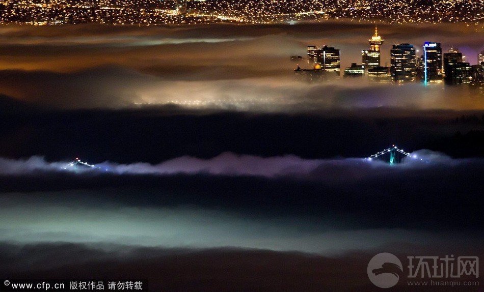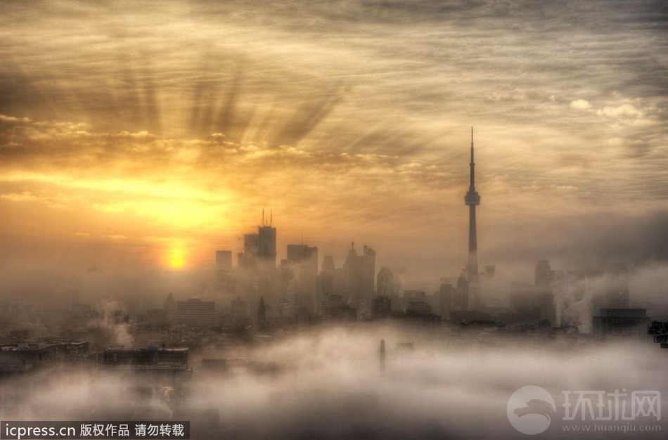 加拿大多伦多遭巨雾笼罩,唯独高耸入云的加拿大国家电视塔冲破迷雾,巍峨耸立。