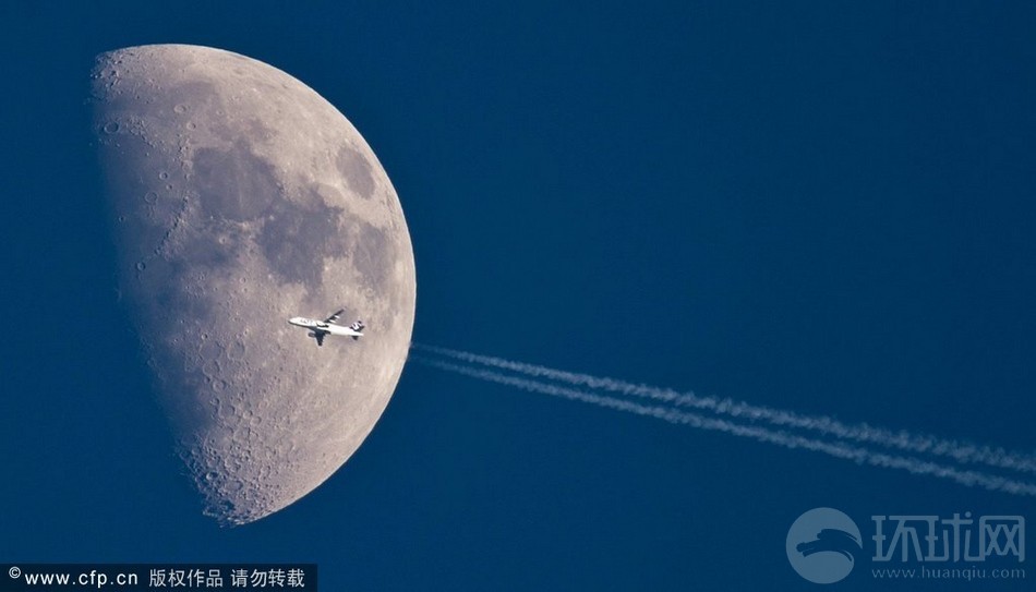 当地时间2012年5月29日,德国法尔肯哈根,长焦镜头捕捉下,画面中飞机似乎朝向月球飞去