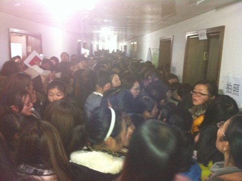 向记者报料的老师肖敏透露,从今天上午9点钟左右来到台州市教育局,就发现报名处人山人海,从大门口排到了电梯口,报名的地点在市教育局8楼,“整个8楼的走廊上都是报名的人”。