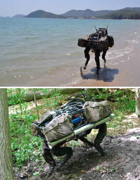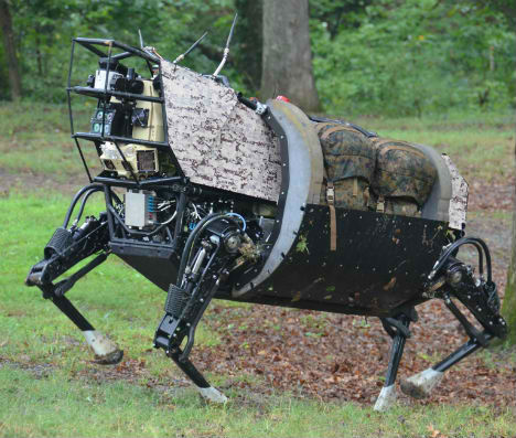 和这种机器骡子相比,普通士兵的负载能力简直弱爆了。训练有素的士兵可以背负45公斤的装备,而这种被称为步兵班组支援系统的机器骡子能轻松背负起181公斤,而且面对各种复杂地形都毫无压力。机器骡子上装有导航系统,还支持声音命令,此外它们还能作为电话等的移动电源。