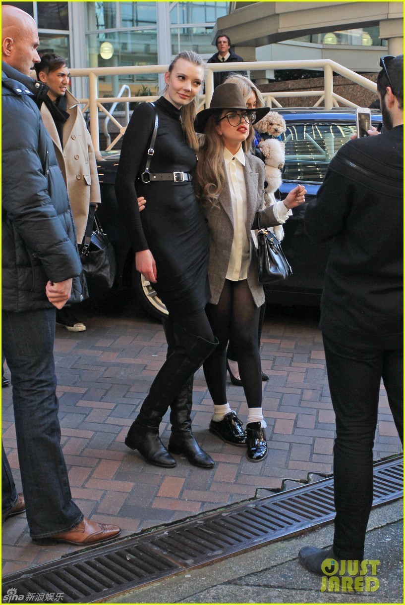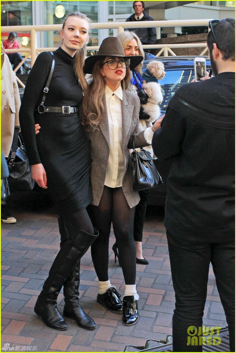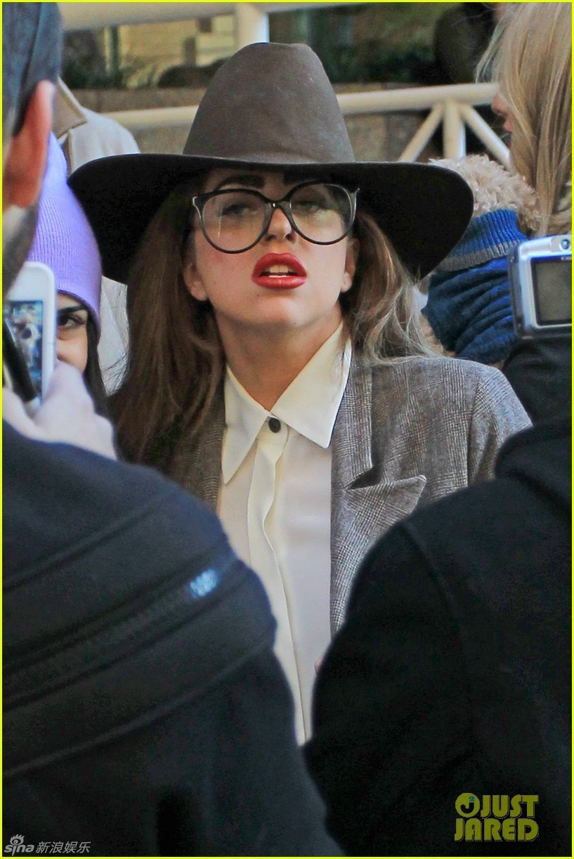 当地时间1月0日,加拿大,Lady gaga现身酒店外与粉丝开心拍照,上身是西服礼帽眼镜的摩登装扮,下身却配了黑丝,搞怪十足。