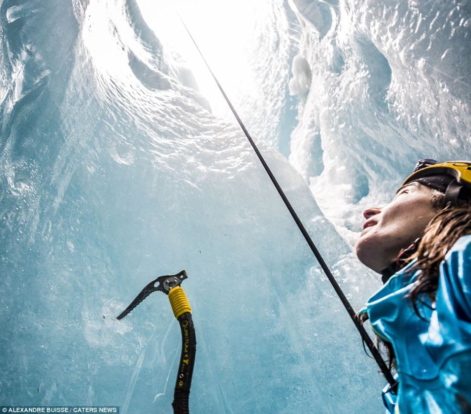 这些令人惊叹的照片显示的是登山者正在攀登一条完全由冰形成的变化莫测的隧道,试图从一个寒冷冰川里的洞穴里爬出来。这些勇敢的探险家看起来像是随时都有从陡峭的冰面上滑落下来的危险,参差不齐的冰面垂直落差超过20米。