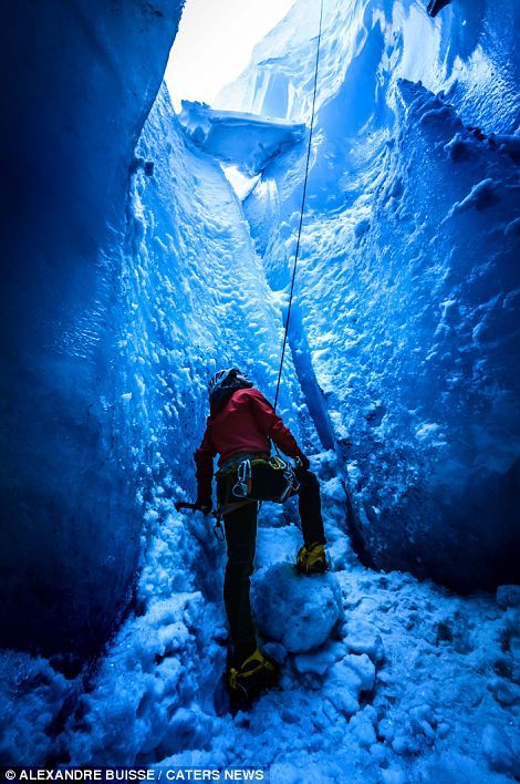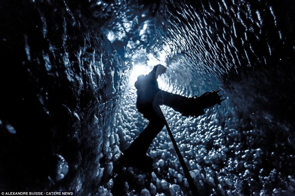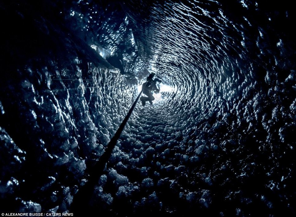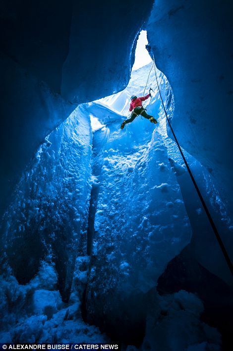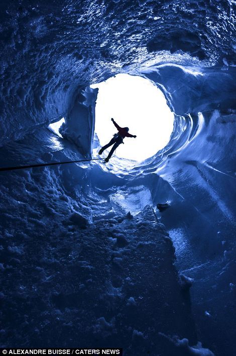 这些令人惊叹的照片显示的是登山者正在攀登一条完全由冰形成的变化莫测的隧道,试图从一个寒冷冰川里的洞穴里爬出来。这些勇敢的探险家看起来像是随时都有从陡峭的冰面上滑落下来的危险,参差不齐的冰面垂直落差超过20米。