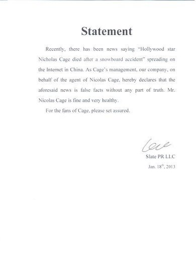 对于网上突然流传的“滑雪死亡”的消息,《劫案迷云》片方受尼古拉斯·凯奇本人及其经纪团队委托,近日发布中文辟谣声明,表示保留追究造谣者法律责任的权利。片方透露,虽然消息的源头是外国某恶搞网站,但是很快就发酵至国内,并且在微博上广泛流传。面对这样的事情,凯奇本人也表示非常无奈。
