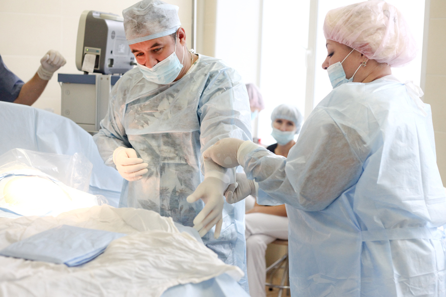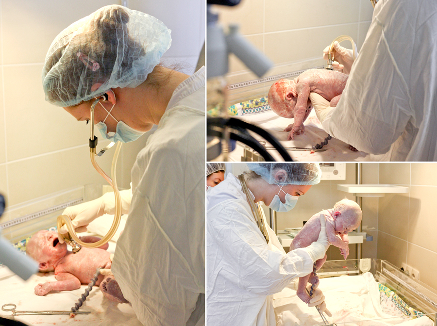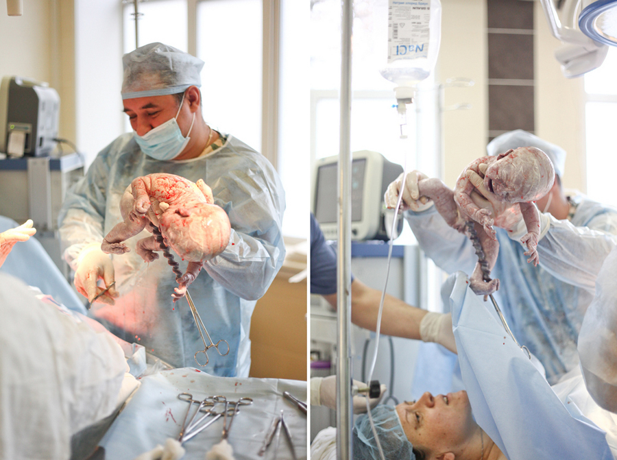 俄罗斯博客作家Karakulova有幸来旁观手术过程,并拍下了一组珍贵的照片,揭秘了破腹产手术的全过程。2012年11月,在俄罗斯第一妇产医院里,37岁的艾琳娜接受剖腹产手术顺利诞下一名女婴。