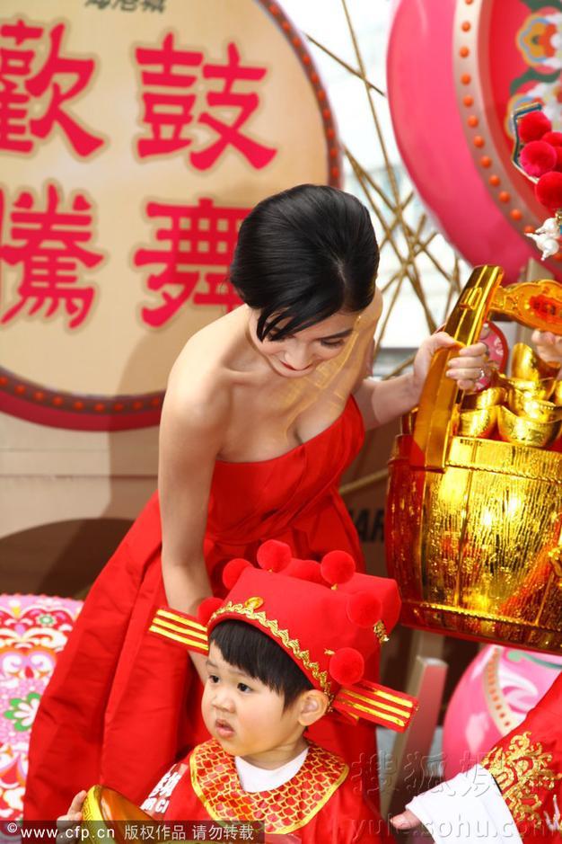 2013年1月31日讯,香港,1月31日,AngelaBaby出席新春抱抱财神活动。过年也是明星捞金的重要时刻,AngelaBaby人红人气高捞金忙不停,她着抹胸红裙大秀乳沟,现场还与财神爷热情拥抱惨遭摸臀。
