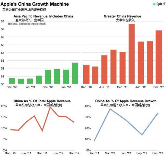 一份单独的报告显示,上一季度,中国市场为苹果公司贡献了68亿美金的收入,而这其中还不包括零售商店的收入。(首席执行官蒂姆库克(Tim Cook)在苹果公司的财报中指出,中国包括零售在内,销售额达73亿美金, 而苹果公司对这一区域仅有零星的数据报告。)中国市场已占到苹果公司销售总额的13%,如果包含零售的话,则占到了14%。在苹果公司12月份的收入增长中, 中国占到了34%, 而这一数据比美国的还要高,美国市场占32%。