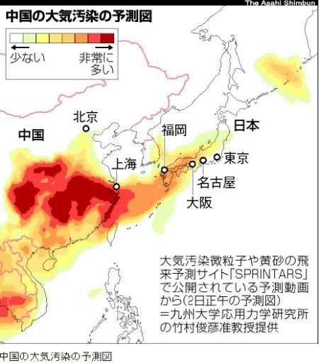 日本科研机构所做的中国大气污染对日本影响的预测图 图片来源:日本朝日新闻网