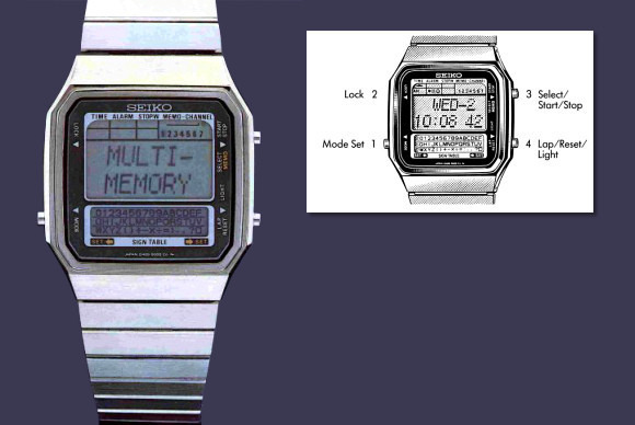 1982年,多家手表厂商都推出了可以存储信息的原型手表。1983年,精工推出首款量产的资料库手表——D409系列。作为一款电子记事簿,早期的D409最多可以存储112个字符作为备忘录。用户可以通过一支触控笔在底部的液晶触摸屏上输入文字。