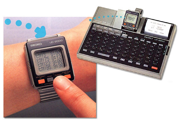 2000,可通过外置键盘将笔记输入到手表中。次年,精工又推出了UC-2000,也可选配键盘/打印机电脑单元,以便将手表作为显示器。与键盘相连时,可以输入文字并运行BASIC语言,或从ROM卡中加载程序显示在手表显示器上。