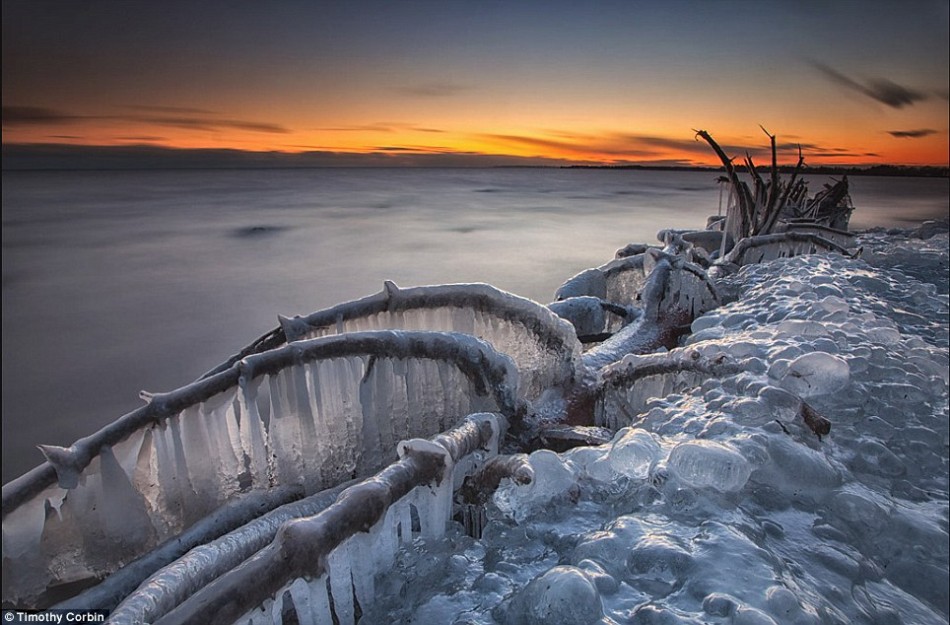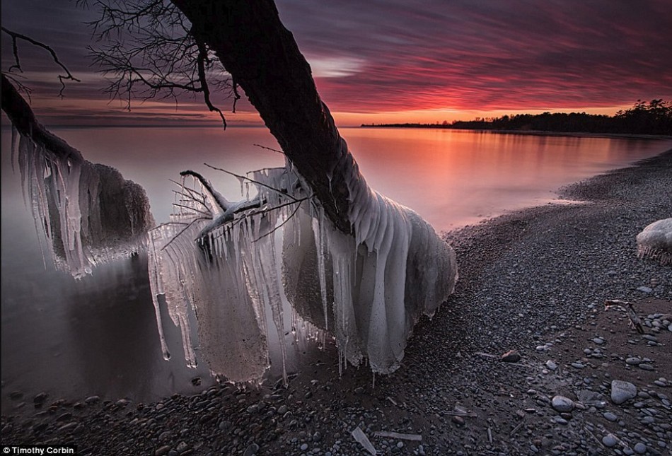 加拿大摄影师蒂莫西-科宾在安大略湖畔拍摄了一组照片,展示被寒冷的湖水冻结的树木。在猛烈的风暴中,湖浪冲向湖岸并撞击岸边的树木,由于温度极低,湖水迅速冻结,将树木层层包裹,形成不可思议的冰挂景象。
