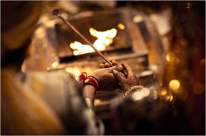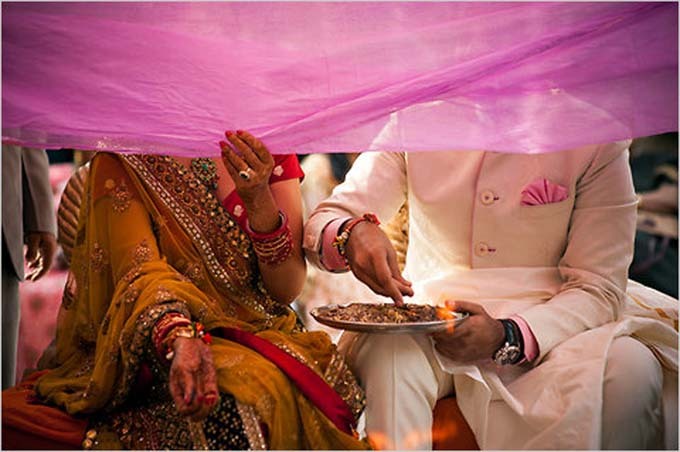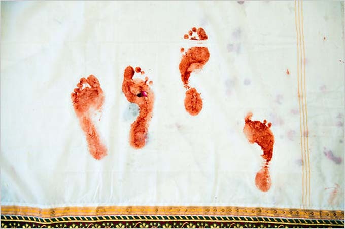 在印度传统中,新娘进入夫家的第一步是非常神圣的。在踢开盛着稻米的锅、踏过装着搀朱砂的水的水盆后,新娘才可以进入夫家的房子。