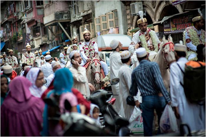 2012年前往孟买参加大型传统伊斯兰婚礼的新郎队伍。2012年曾有318对夫妇同时在那里成婚。