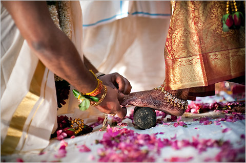 印度喀拉拉邦的婚礼上,新郎为新娘戴上银制的足环。在印度南部,这种足环被视为婚姻的象征。