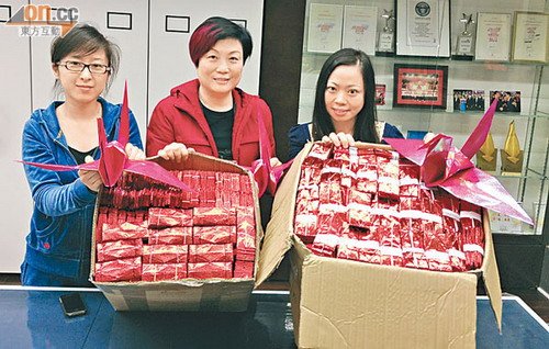 陈太(中)展示哥哥粉丝所送的纸鹤。