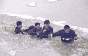 情急之下,身高181厘米、体重170多斤的吴来鹏,跃起身体,然后扑向冰层,就这样跃起、扑倒、跃起、扑倒……借助体重和惯性的力量破冰。沈志坚则在后面把破碎的冰块扔向两边的冰面。