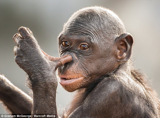 业余摄影师格雷厄姆现年41岁,他花了6个月时间拍到这组照片。照片中,两只倭黑猩猩在互相梳理毛发时似乎在表达倾慕之情,另有一只倭黑猩猩则在厚着脸皮挖鼻孔,而一只比较害羞的狐猴则对着摄影师的镜头摆出臭脸。