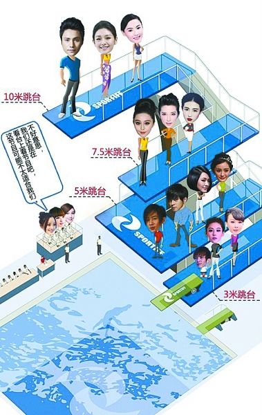 现在做个明星还真不容易,在舞台上比脸蛋比身材比唱功比演技已经无法满足得寸进尺的观众了,今年浙江卫视和江苏卫视不约而同推出了两档“明星跳水秀”《中国星跳跃》和《星跳水立方》,让明星们挑战跳水这项高难度的运动项目。节目还没开播,网友们已经乐翻了天:“这绝对是检验明星的最高标准!各种素颜、身材、运动协调性、柔韧性、无刘海、落水、面部表情管理……这一通折腾下来,你们是业界良心!敢上你们节目的明星才是真的明星。”