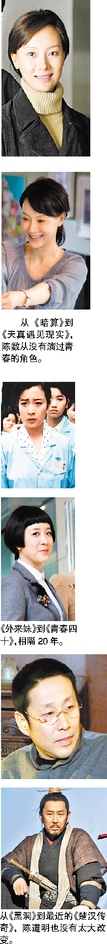 出生于1968年的陈小艺,1991年凭借《外来妹》一炮而红,那时候,她还是一个大四的学生。因为饰演的是一个外来妹,她的角色让她不施粉黛也并不鲜嫩,更多的是与青春相伴的泼辣与勇往直前。2005年,与孙红雷合作出演的《半路夫妻》让她再度声名鹊起,观众发现她的面容似乎没有多大变化。2011年,和徐帆等人合演的《青春四十》中,齐刘海、娃娃头的她,更是让人看到了“逆生长”的痕迹。