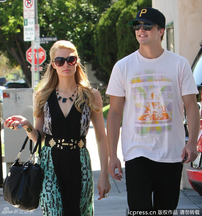 » 希尔顿拼色长裙端庄 小男友P字帽表忠心(组图)