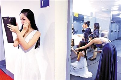 会展中心,上台走秀前,在洗手间内化妆的模特。