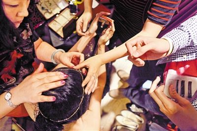 龙岗某商场,忙碌的化妆师和造型师正在给模特装扮头饰。