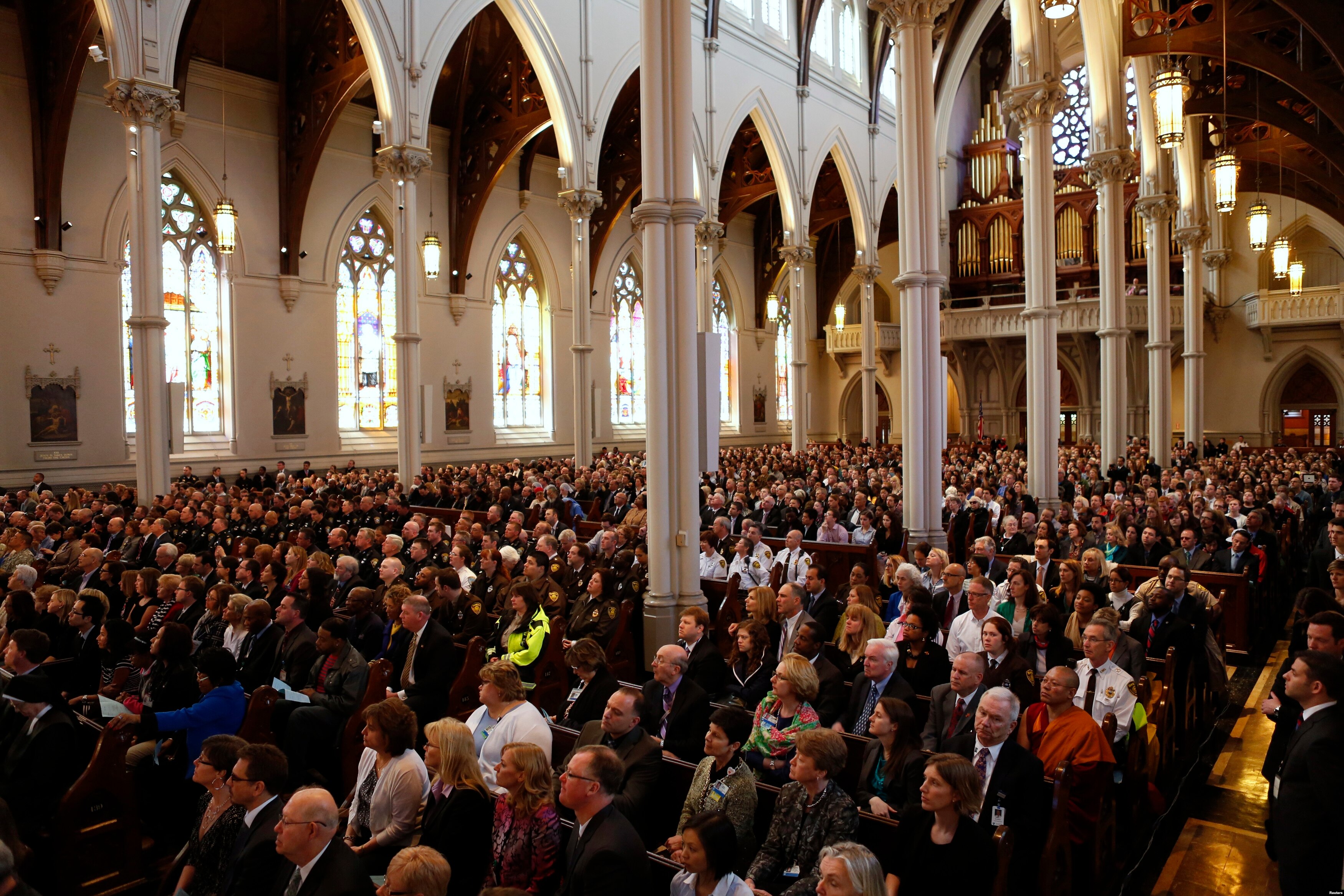 4月18日人们参加在圣十字大教堂为波士顿马拉松赛爆炸案受难者的跨教派追思会。
