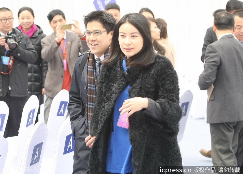 郭晶晶大衣遮肚显孕象 与霍启刚亲密亮相(组图)