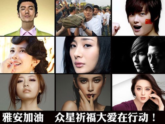 在得知雅安发生地震灾情后,黄晓明第一时间通过腾讯乐捐平台捐款20万。 目前正在国外拍戏的范冰冰(微博)在得知雅安地震之后也希望能够和大家一起为震区的人们贡献自己一份力量,通过壹基金为震区捐款30万元,并通过其工作室微博表示,“希望能有更多“水滴”汇聚在一起成为涓涓细流,成为爱的海洋,传递温暖。为震区祈福,一切都会好起来的。”