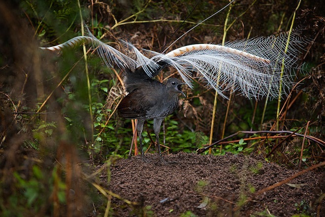 琴鸟(琴鸟属):澳大利亚琴鸟喜欢通过歌声吸引配偶。雄性的示爱方式包括每个个体产生的独特美丽曲调,并伴有从周围环境学来的声音。由于与其他鸣鸟相比,它们拥有肌肉最为复杂的声带,因此琴鸟能模仿各种各样的自然和人造声音,其中包括电锯声、汽车马达声、狗叫声和人类的声音。