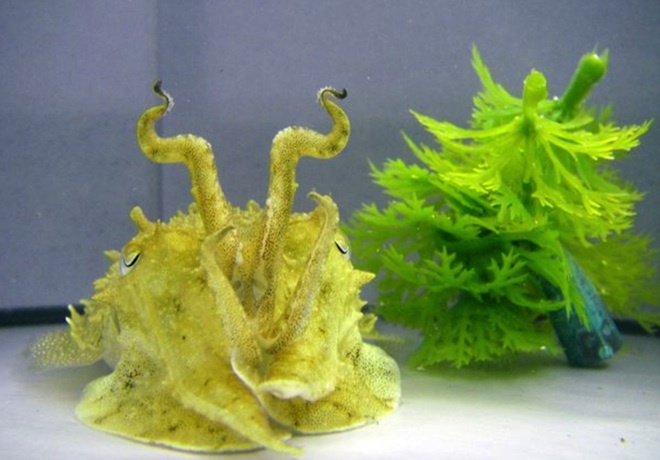 乌贼:位于照片上方的那个黄色的东西,是一只乌贼正在模仿一种水族馆植物。乌贼这种会变形的伪装高手,能迅速与周围环境融为一体,以躲避天敌。它们能伪装成任何水生生物,模仿各种姿势和颜色,乌贼之所以能够自如变换颜色,是因为它们皮肤里有带色素的液囊。