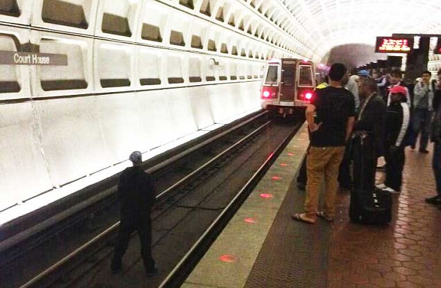 当地时间7日下午,位于弗吉尼亚州阿灵顿的华盛顿地铁站发生惊人一幕——一名身份不详的男子在地铁到达之际故意从站台爬到地铁铁轨上,凝视前来的列车,幸亏列车员及时刹车,才避免了悲剧的发生。但这个小意外还是耽搁了地铁正常运行,警方随后介入其中。