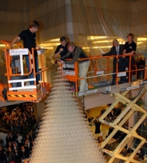 2008年1月25日,在比利时的Wijnegem购物中心,来自荷兰的Luuk Broos和同伴用43680个玻璃杯搭起了一个金字塔(也称香槟喷泉),共有63层。
