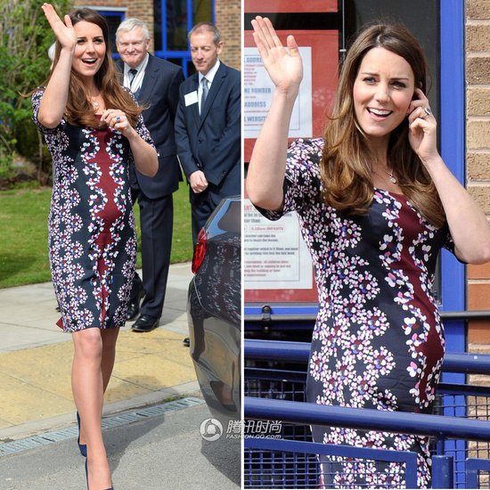 2013年4月23日,英国曼彻斯特,凯特王妃(Kate Middleton)挺孕肚造访小学,民族风印花贴身连衣裙优雅简洁,温暖的笑容,充满了慈爱。