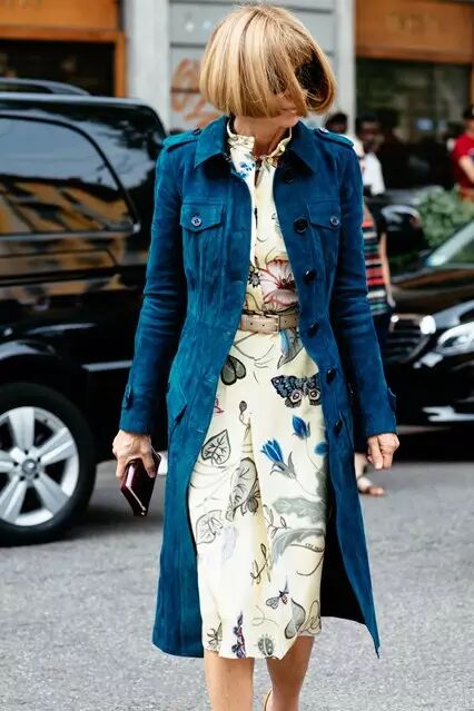 ▼时尚大主编安娜的印花连衣裙配风衣,是职场装的典范之一