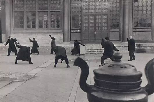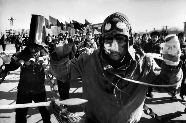 在北京北郊的村子里,由工农合作社组织的庆祝农历新年的表演,由京剧演员和农民共同参演,1957