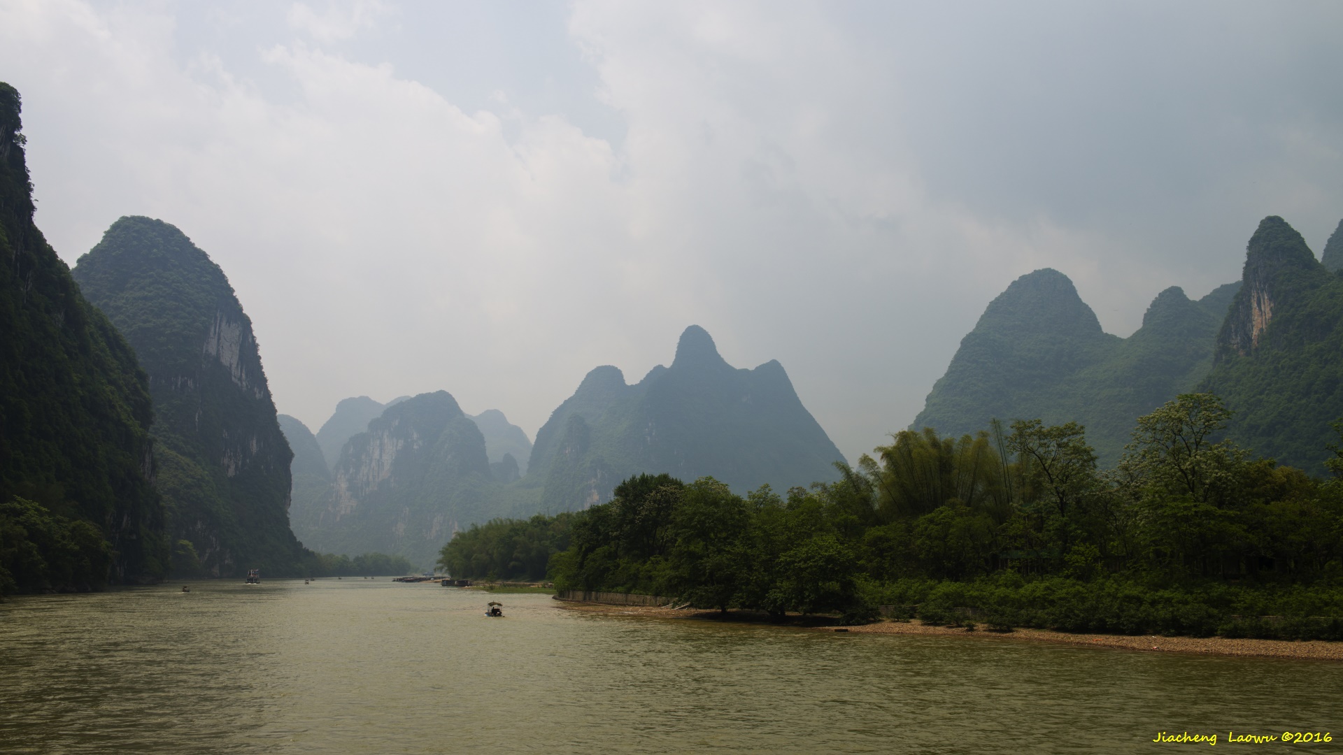 第二天按原计划乘游船沿漓江南下,晚上住阳朔大榕树景区,重点游览阳朔周围。头一天在选择游船的时候听了当地人的建议舍弃了 豪华游船而选择了普通的游船,后来发现这是一个非常错误的决定,浪费了宝贵的时间。 一大早就接到导游的电话让在宾馆对面的马路边等候旅游大巴,左等右等就是看不见来接的自己一行的大巴,打电话问才知道车还在路上。 就在等车的时候,天色越来越暗,风声越来越紧,在车快到的时候,突然间天空雷声大作,大雨霹雳而下。我们全家在暴雨中登上了旅游大巴, 到了车上才知道前几站的客人没有按指定的时间在路边等车,反而是车到后导游打电话催他们。游览漓江比较怪,船票不直接卖给游客, 而是要通过旅行社。对于自由行的散客,旅行社的任务就是从用大巴从每个游客住宿的旅馆附近接人,然后送往码头。 到码头后, 导游去他们的上家领船票,发给大家后就结束了使命。我们上大巴后,车还要接其他的人,一路上雨下得很大,快到码头的时候, 雨点渐渐地变小了,到码头后就停下来了,后来居然有了阳光。到了码头看见到处是人,导游们手里挥舞着小旗子,喇叭的音量一个盖过一个, 领着一队一队的人马川流不息地前行。其实这是一个无假无节的普通周六,如此庞大的人流出乎我的意外,深深后悔应该去外事码头乘坐豪华游船。 我看见我们车上的导游从一个老太太那里领票,花了足足半个多小时的时间,我拿到的船票是是最后的一波,11点才能出发.