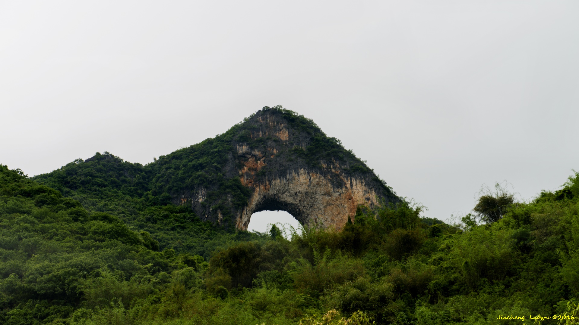 第二天一大早来到桥头,这里依然是只有我们全家的天地。 不过,厚厚的云层笼罩着天空,早晨的阳光被阻挡在云层之内, 始终没有露出头来。我们在桥上停留了许久,等天大亮后沿十里画廊往北走,在这宁静的时光里观赏者沿路色山峰。 一开始的时候一路很少有车辆,后来路上的车越来越多,非机动车道上也不时地有摩托车鸣笛。我们徒步走了很久,大约在图腾古道附近, 家人开始有人抱怨肚子饿了,我们才往回返。桥头北边的餐馆和店铺都已经开业了,我们选了一家进去吃早餐。 回到桥南,找到了第一天和我们搭仙的人,从她那里租了两辆自行车,沿十里画廊朝南直奔月亮山。月亮山在十里画廊最南端, 但在南行的方向上很不容易看见,直到我们出了十里画廊,看见前往高速公路的岔口时,才感觉到已经过了。询问周围的老乡后, 再折返回去,终于看见了要找的月亮山。月亮山找到不容易,找个好的角度看就更不容易。十里画廊上没有专门看月亮山的观景台, 公路边的树挡着风景,远处的竹林又挡在洞口。买门票进入月亮山公园更是很难看见那个像半个月亮的山洞, 这和在桂林看象鼻山的境遇很类似。十里画廊沿途风景不错,路边有很多水果摊和餐饮店。 游十里画廊不需要门票, 但沿路好的景点都要单独买门票才能进去。 但是,这是在一条繁忙的国道上,来往的大型车辆呼啸而过, 专门开辟出来的一小边上又有很多摩托车,无论在这里步行或者骑车,一路都是提心吊胆。